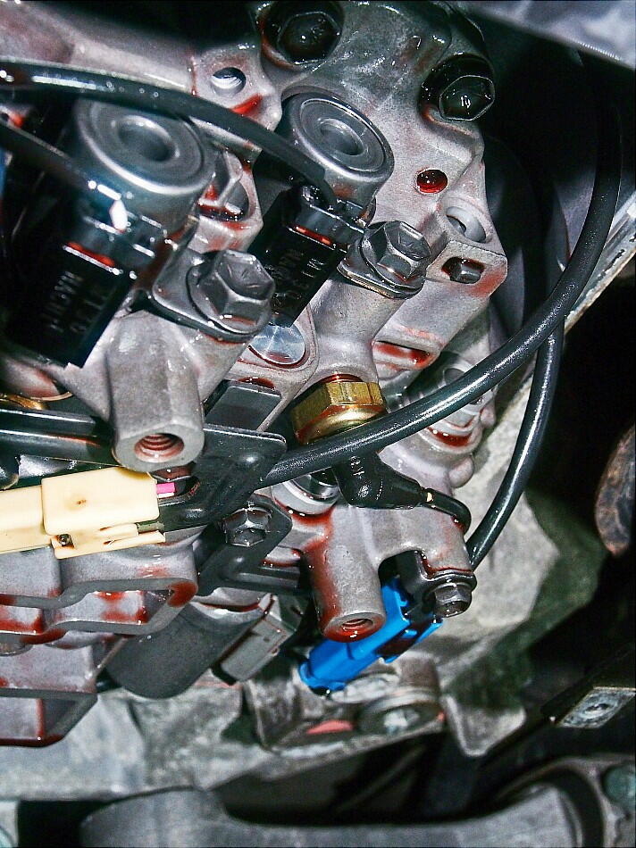 一服後、未だ垂れが収まっていないが、ATFスクリーン( フィルター )も取り外す。 ここでも、オイルのシャワー。 昼飯を兼ねて、小一時間放置。 それでも、滴り落ちる状態なので、ウエスで拭き取っていく。 その後、ハーネス、コネクタの確認。 ハーネスは、未だ柔軟性有り。 コネクタも割れ欠け等も無く問題無し。 以前、プレッシャーセンサーの異常が一度だけ出ていたので 目視確認するが、問題は無さそうだ。 ( やはり、GNDがプアだった事が原因の様だ )
