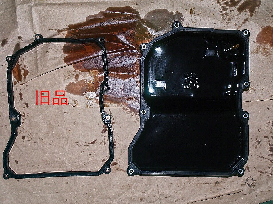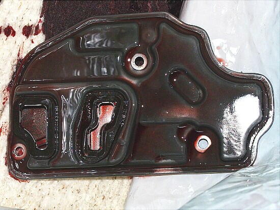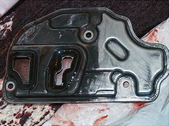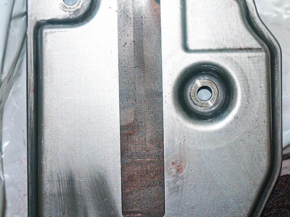 考えていても仕方がないので、オイルパンを外しに掛かる。 8個のボルトで止まっているので、トルクレンチを使用して、正規のトルクで 締められているかを確認しながら外して行く。 正規のトルクは、7Nm で、ほぼ合っていた。 全てのボルトを半分程緩めた状態で、オイルパンを下方に引っ張るが、ビクとも動かない。 オイルパン周辺をゴムハンマーで軽く叩き、シールゴムとエンジンブロックの隙間に ファスナーリムーバー差し込みこじると、外れた。 オイルパンを手で支えながら、全てのボルトを外し、オイルパンを床に静かに垂直移動。 この際、バルブボディから雨の様にATFが 降り注いだ。 これが、嫌なんだよね。