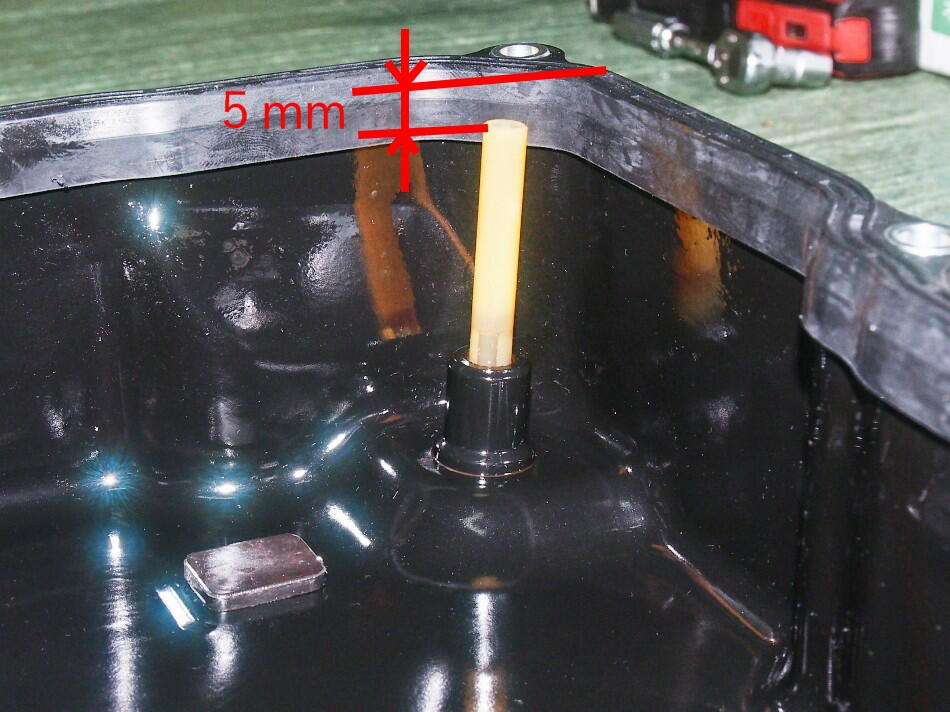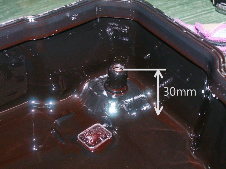 オーバーフロー パイプを取り付けて、オイルパン周りの整備は終了。 ATFを注入するレベルが、下画像。オイルパン上面から下に5mmまで、ATFが満たされる。 今日は、最後にオイルパンを実装して終了。