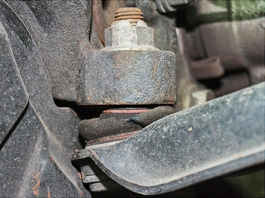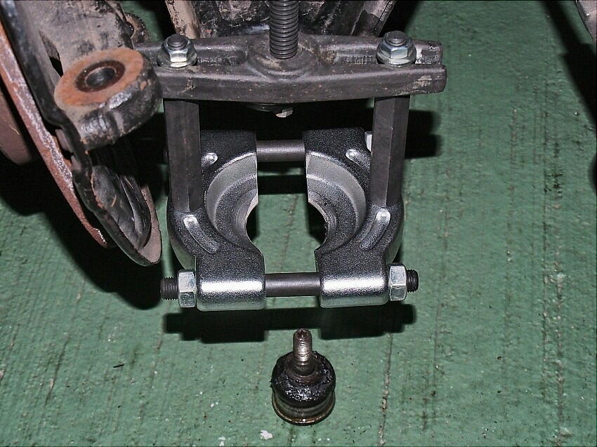 上の工具では抜けない事が判明。ギアプーラーも駄目。 transverse control arm ( ロアアーム )先端のボールジョイント周辺が極端に狭く、工具の固定が出来ない。 いっその事、ロアアームを取り外す事を考えたが、プレス機が無い為 断念。タイロッドエンド、スタビの固定を 解いて、作業スペースを確保する。