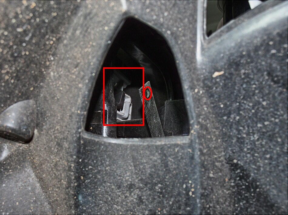 よくよく見ると、下写真の穴の向こう側に、ホーンを止めているナットが見えた。( 下写真は、既にナットを外した状態。 赤〇がナット 赤四角がホーン位置 )