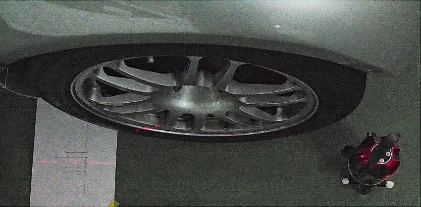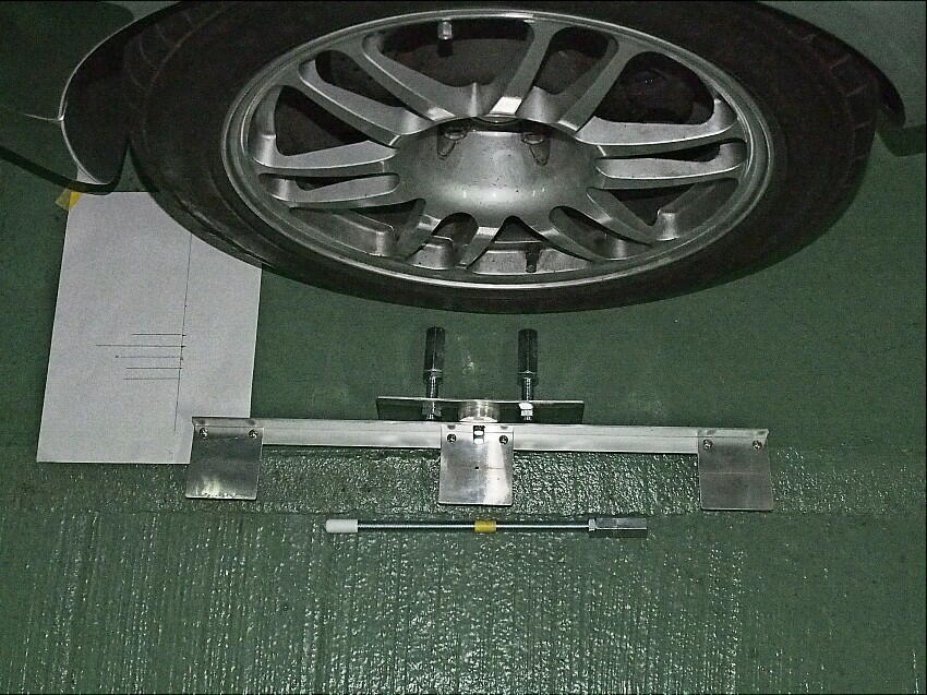 トー角度のゲージを作るために、タイヤの端にレーザーを置き、反対側に紙をセットする。 レーザーで±1°と ±2°振って 紙にポイントを描いて置く。