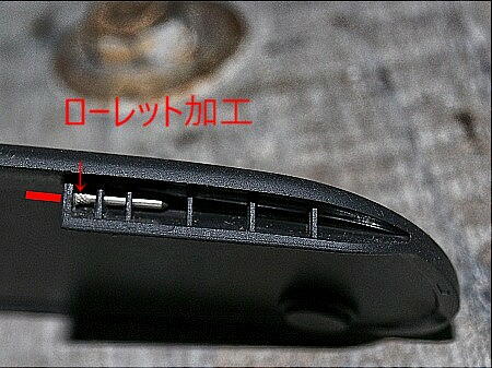 これで終わりか ? と思いきや、反対側のピンの状態も変だ。 こちら側は、ピンが折れていた。 本来なら、赤線の様にピンが出ている。 折れたピンの先端を見ると、固定用のローレット加工がされていた。 そこで、一旦ピンを抜き、180度回転してピンを差し込んだ( 下右 これで、ピンの脱落は無い。