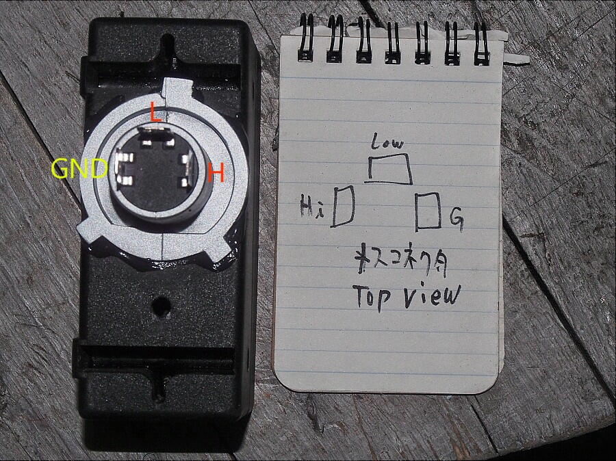 H4球の端子機能は、下の通り。 使うのは、GND と Low 。 コネクタの幅が広い。 生憎 この雌端子の手持ちは無し。 直接半田付けして配線を出す。