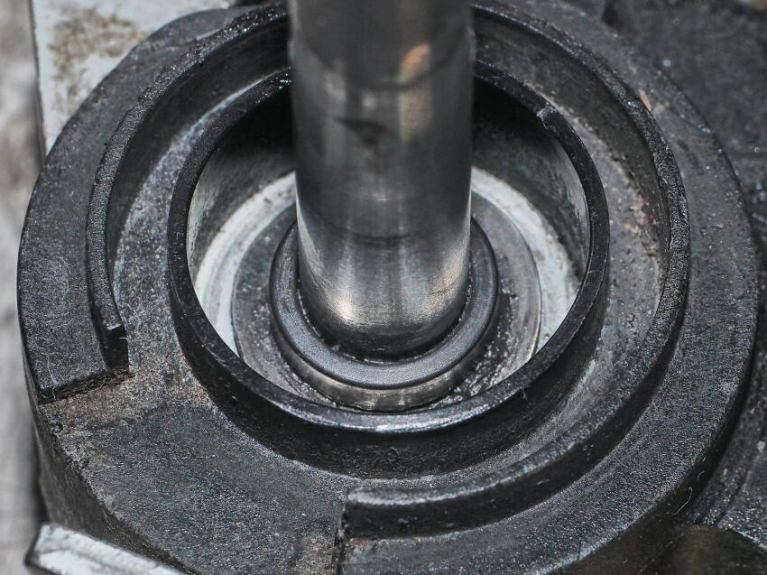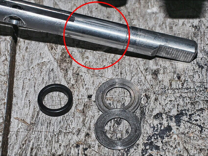 スロットルで二次吸気が有るとすれば、シャフトか、パッキン類。シャフトのOリングを外して、全バラにする。 シャフトには、少しのグリースが残っている。シャフトと軸穴を洗浄して、シャフトを挿入してみる。 ガタ付きは当然ないのだが、シャフトの挿入感( 手応え )が、薄い。スルスルと入ってしまう。表面を見ると 回転に伴う擦り傷が付いている。やはり摩耗が進んでいる。パッキンも、しなやかさが無い。