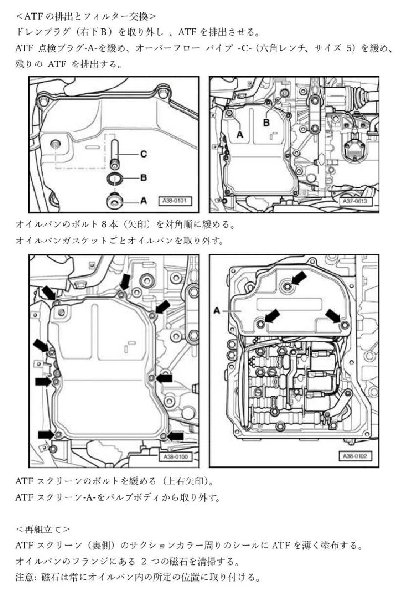 兎も角、一度も交換していないATF( 23年間 )、走行距離 41,000kmの状況を考えて、交換する事にした。 マニュアルを読むと、交換時の温度管理を煩く書いてある。 ここは、VCDSを繋いで温度を監視しながらやれば良いのか。 今回は、ATF交換に伴い、フィルター、オイルパンのパッキンの交換もする。 予想するに、2柱リフトの作業なら簡単だろうが、低床ジャッキアップでの作業なので、かなりやり辛いだろうし、オイルまみれになりそうで 気が重い。 また、オイル注入の仕方で苦労しそうだ。 これは、下記のマニュアルで、機構的に変な部分が有る為だ。