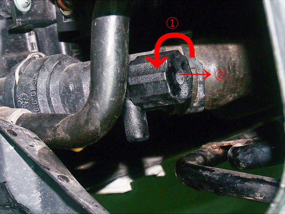 リセット作業は、LLC、センサーの交換となる。 まずは、ドレンプラグからLLCを抜く。 反時計回りにノブを回した後( 90度ぐらい回る )、 ノブを手前に引く。 これで、排出が始まる。 ( 閉じる時は、ノブを押し込み、ノブを時計回りに回せばロックされる )