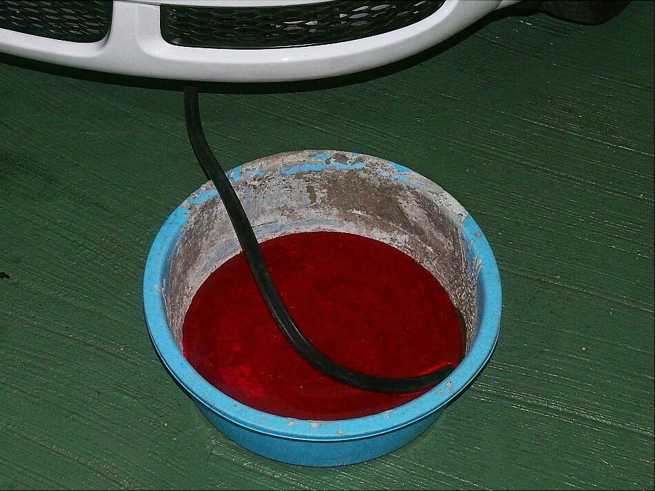 その前に、リザーバタンクの蓋を開放させ、ドレンプラグにはホースを突っ込んで置く。 ドレンプラグから直接排出すると、LLCが 飛び散るので、その対策。