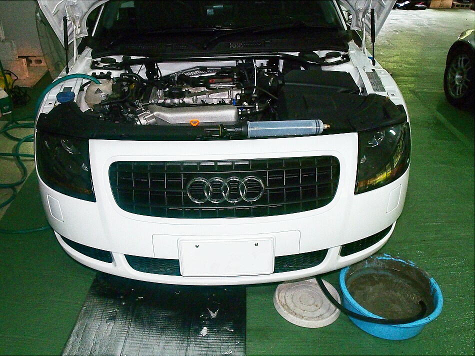 LLCは、5L入る筈。 ブリード プラグが無いこの車、エンジンを掛けて、空気を抜いていく。 4L入った所で入らなくなった。 一旦エンジンを切って、冷却した後 付近を走行しながら、LLCを補給( 合計で4.5L )。 最後に、漏れが無いかを確認して終了。
