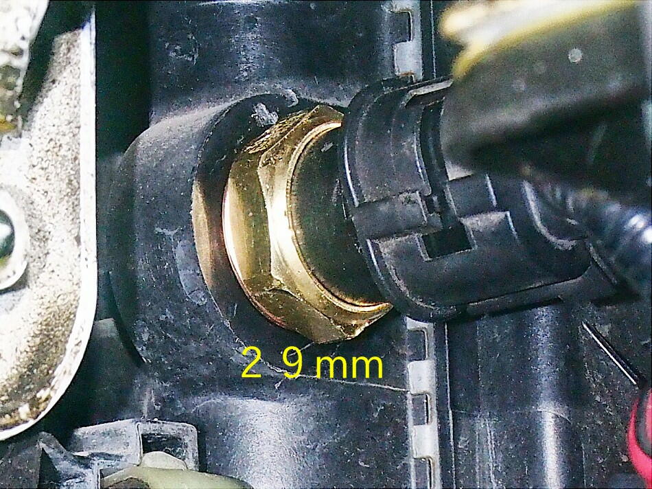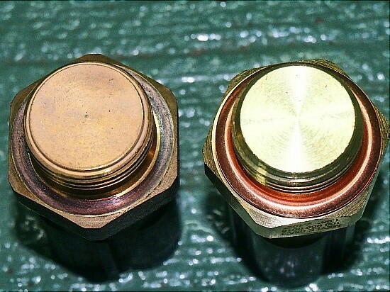 次は、サーモスイッチ。 これが壊れると、ファンは回らない。 ECUも検知出来ないので、オーバーヒートを引き起こす。 交換したか否かは定かではないので、即刻交換する。 旧品を見ると、銅のパッキンが ...... 潰れて本体の真鍮ブロックに減り込んでいる。 馬鹿力も 度を越えている。 これじゃ、シールどころか漏れる。