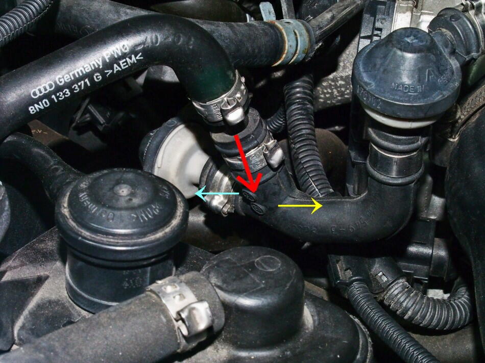 | キャニスターから、気化したガソリンを戻す箇所が二つ有ると書いた。 赤矢印 : キャニスターからパージされたガス 黄色 : スロットルへ 水色 : ターボ吸気側へ