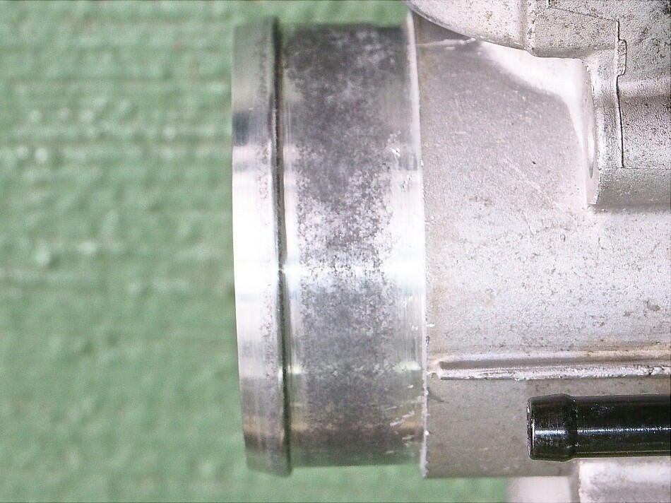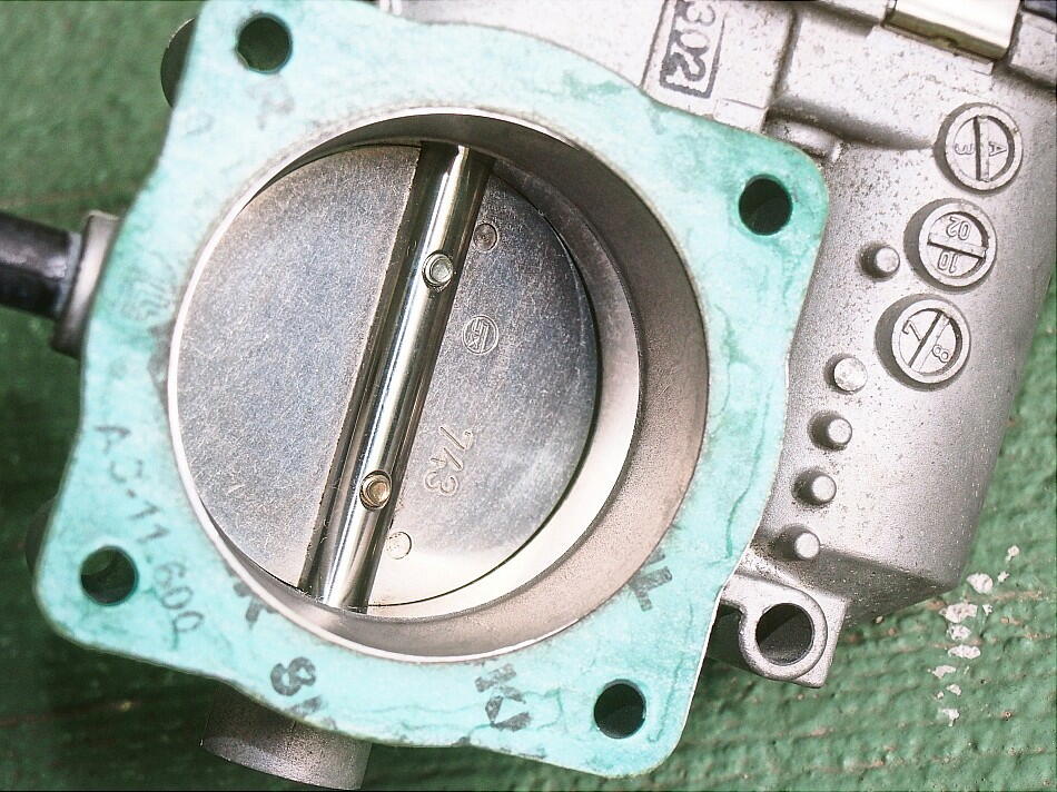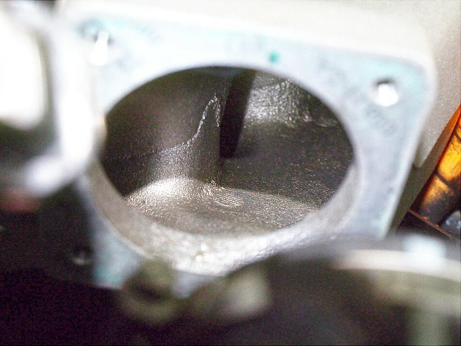 締結バンドをカットし、パイプ類、コネクタ、ボルト4本を取り外す。 吸気パイプ側のバタフライバルブを見た時は、そんなに汚れては いなかったのだが、チャンバー側は 御覧の通りの汚れっぷり。 固形化していて、拭いただけでは落ちない。 特に酷かったのは バタフライバルブ直下で、アイドリングに必要な隙間が少なくなっていた。 これじゃ、アイドリングに支障を来たし兼ねないね。