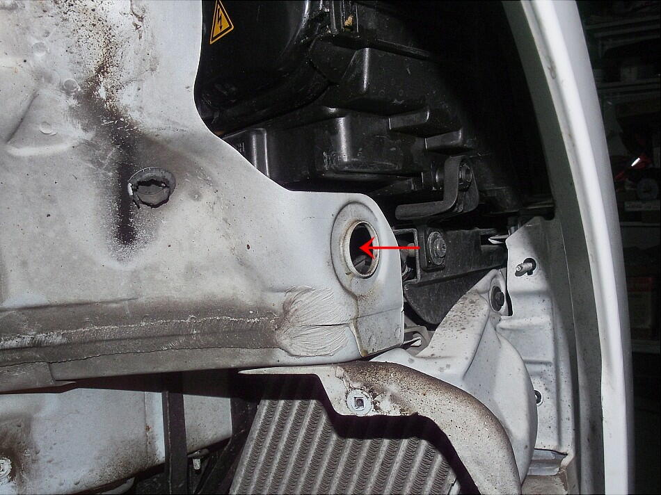 ライトで照らすと、下写真の ←奥 ! 上部にはヘッドライトユニットが有るし、矢印の所には鉄板が有るし ... 大体何だこの鉄板は この鉄板さえ無ければ、手が届くし .......