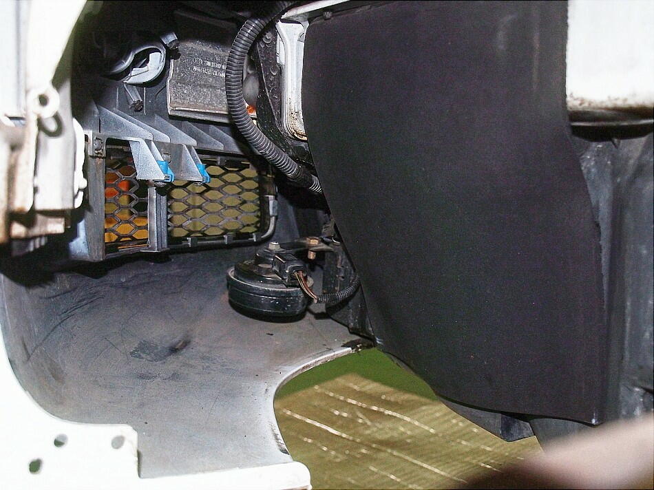 ラジエータへの導入を妨げず、エンジンルームに外気を導く為に、遮蔽板を設置した。 簡易なウレタンだが効果は有るだろう。