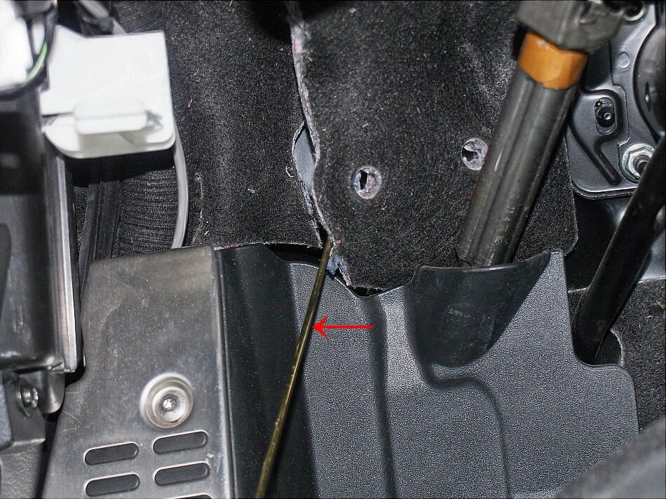 確認の為、サービスホールから真鍮の棒を差し入れて見た。 フットレストの右上当たりからセンサーからの配線を出せる様だ。