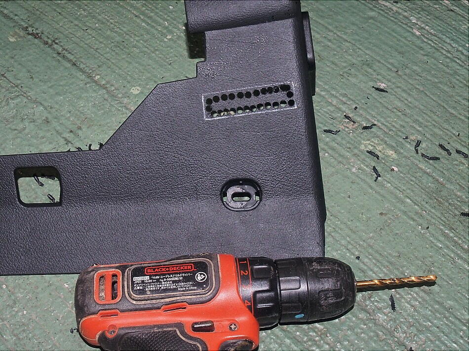 これに、躊躇なく取付穴を空けて行く。 後は、ニッパでカットし、ヤスリで仕上げる。