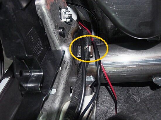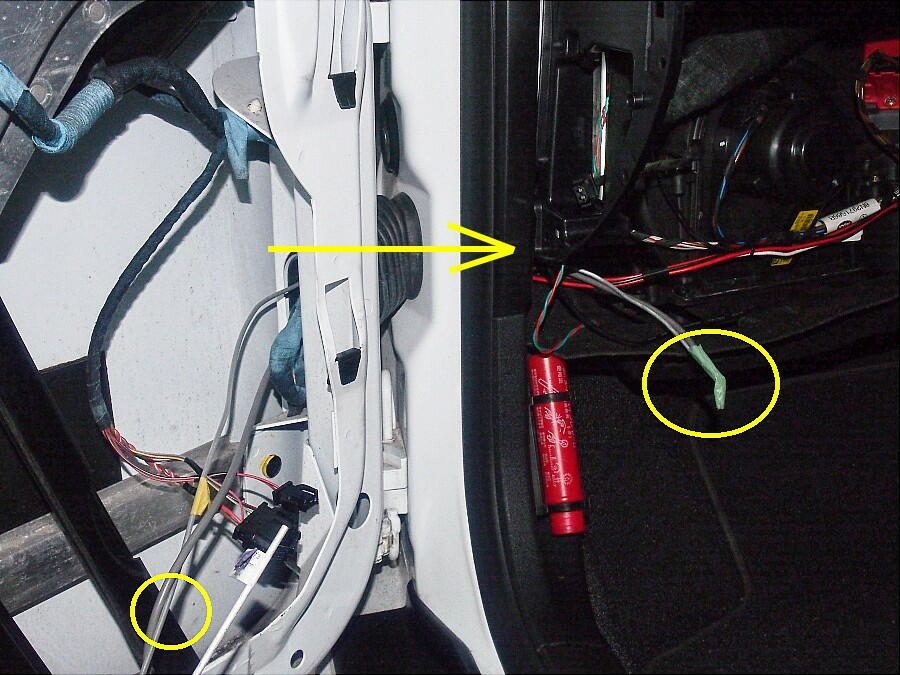 ここまで、確かめてしまうと ...... サルは止まらない( 笑 セントラルロック システムへの経路は、グローブボックスを外せば解る筈。 で、外したのが、下写真。 左端に、黄色〇で囲った配線束が有る。 それを拡大したのが、右側。 解り辛いのだが、黄色〇に保護テープが無い部分が有る。 ここに、茶/白 と 赤/黒の線が見えた。