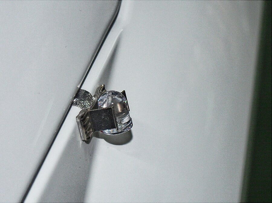 そこで、シンプルにLEDだけにしてみた。 LEDは、Φ10mmの砲弾型。 さて、色だが、赤は法規に触れる、黄色オレンジ系は ウインカーと似て紛らわしい、残るは 白か青。 白は詰まらないので、青にした。 直接LEDは見えないが、左フロントがボヤーと光ってるだけでも良い。