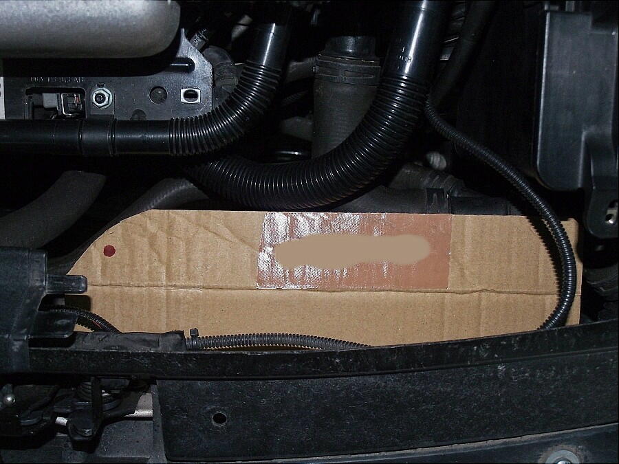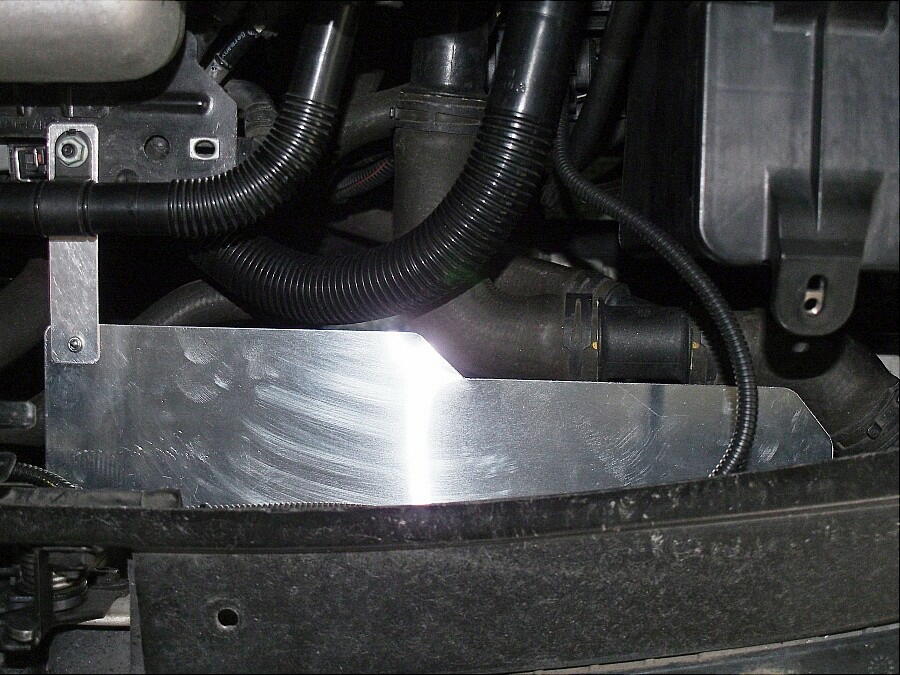 材料は、結局Webで注文した。 t=0.8mmのアルミ板が適当と考えた。 カッターで傷を付けて折り曲げれば、切断は簡単。 型紙とは ちょっと異なる形となった。 塗装しようと思ったが、ダルイので止めた。 取付は、インマニ横の固定ボルトと共締めにした。 ここだけは、強度がいるので、t=1mm板を使用した。