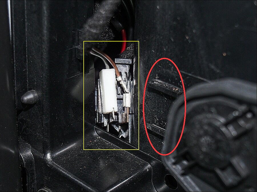 そこで、配線を変えようかと、サイドパネルを外すと ....... スイッチ(黄色□) が、ホルダー(赤楕円)から外れて、奥の隙間に 嵌っていた。