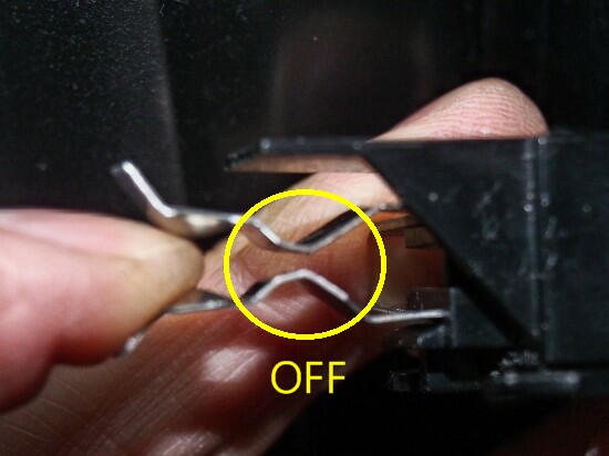スイッチをホルダーに嵌め直して、蓋を閉めた状態が下写真。 電極間に絶縁板が嵌って、電極が離れた状態( OFF )となる。