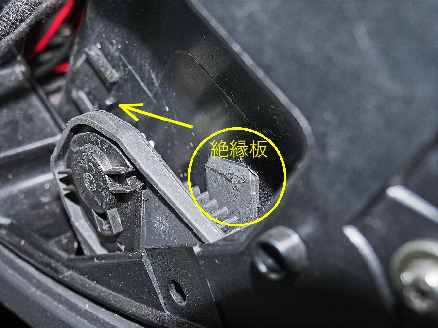 では、何故ホルダーからスイッチが外れたのか ? 原因は、ホルダーの隅が割れていたから( 下写真 )。 構造的に、無理な力が掛かった形跡が有る。 蓋の開け閉めで、絶縁板の位置が左右にズレれば、電極に当てってしまう。 その結果、ホルダーの破壊と共に、脱落のシナリオ。