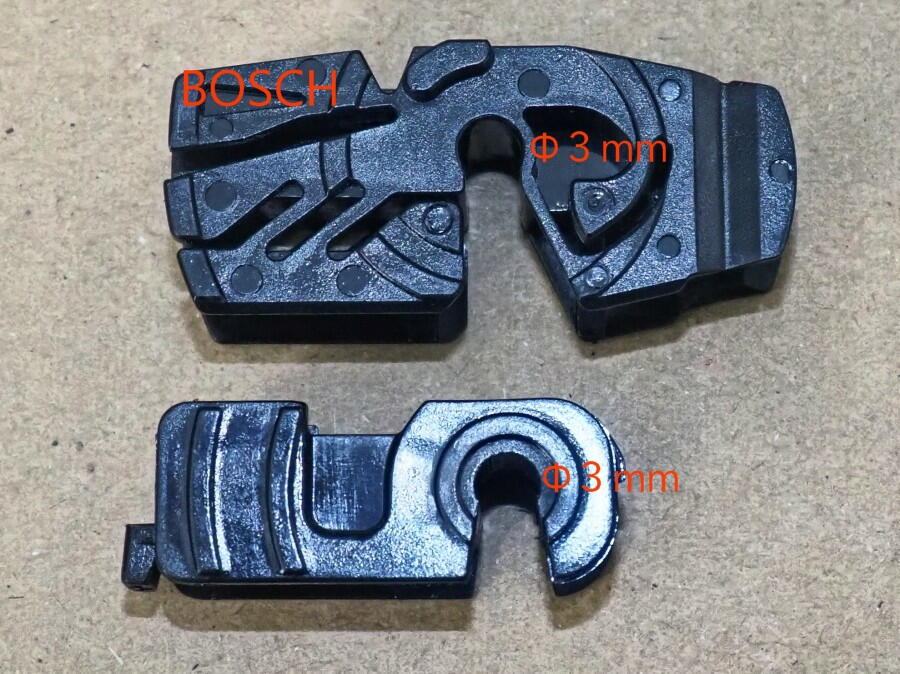 このまま使えないとなると、まずい。 U字フックが嵌る部分を見ると、形状、長さが大分異なる。 BOSCH製は、アームを固定する 部分に爪( 下 丸部 )があり、固定部分も長い。