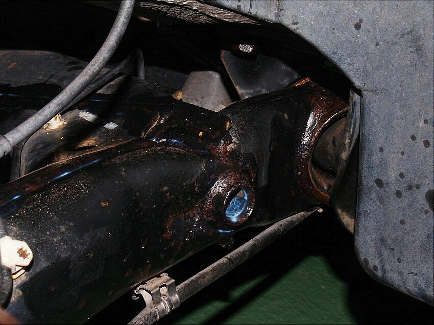 | 下回りに、結構な錆びを確認した。酷いのは、ロア/アッパーアーム、排気管周り。 下は、右後輪。金属ブラシで処理した後。 錆びの深さは浅いのだが、放置は出来ない状態。とは言っても、取り外して 研磨&塗装 なんて、する気は無し。 これは、錆び置換剤で処理するか。
