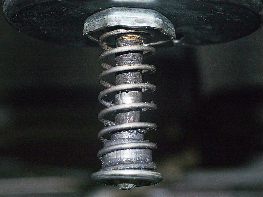 ヒンジ部のシム追加で、ラッチ部辺りのエンジンカバーは、若干下方に移動する。リリースハンドルを引いた時の 手ごたえと同時に、ガコッと勢い良くエンジンカバーが跳ね上がらない事を考え合わせると、ストライカー部のバネ 圧縮力が低下していると思われる。 となると、現状の ” バネ長 ”が、長い状態なのか ?。 ロックナットを緩めて、ストライカー長を縮めるか。 これも、緩めると前後左右に動くんだよね。