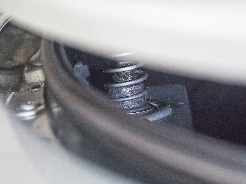 ロックナットを緩める前に、ストライカーとラッチ部の位置関係を見てみる。エンジンカバーを少しだけ開けて 見てみる。 ライトを当てながら非常に見辛いのだが確認すると、左右方向はOK。 しかし、前後方向は酷い状態。 ストライカーが、後方に寄っていた。目視する限りでは、3mm程ズレている。これが、原因だ。 ロックナットを緩めて、前方に移動させる。そして、位置を決めた後が下画像。( 白線が修正前の位置
