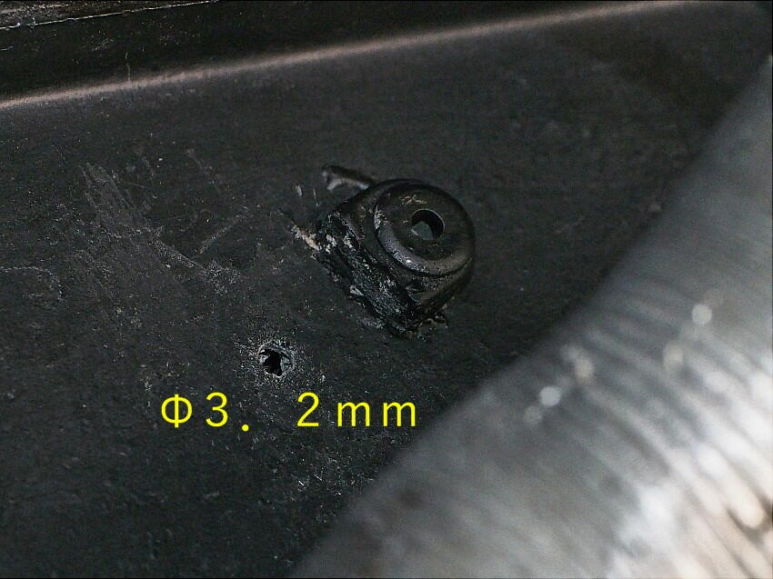 この固定台は、リベットで止められている。リベットをドリルで揉んで取り外したいのだが、エンジンカバー内に リベットの破片が落ちてしまうと ...... 動き回ってカラカラと煩くなる。( 現存させるしかない そこで、残っているプラスチックを除去した後、リベットを打ち込む事にした。 穴開けの前に、黒艶消しで塗装。 リベットの下穴を開ける。この部分は、FRPなので軽く穴が開く。