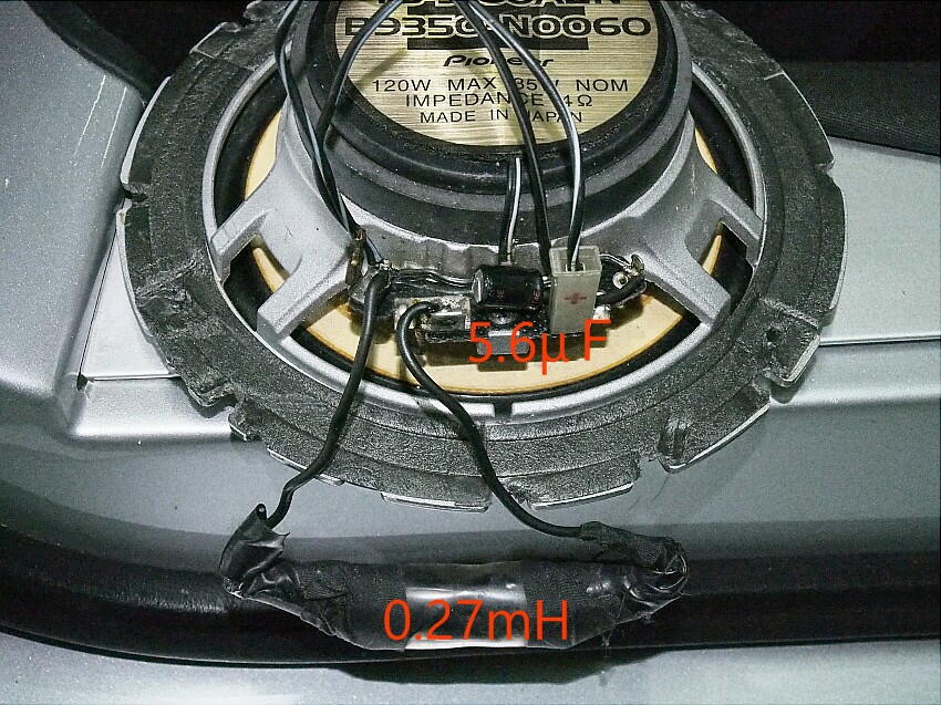 そこで、ツイータで試してみようかと。 確か、K社の物が有った筈 ....... 見つからない ! 有ったのは、音量が無い ( 蚊が鳴くような音しか出せない ) ツイータが有った。 これで、試してみる。 リアスピーカから分岐させて繋げる。 試しなので、下の様に宙ぶらりんの状態で聞いてみる。