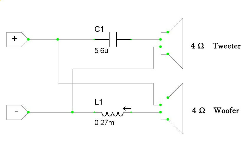 ミッドレンジとツィーターが一体となっているスピーカ。 回路が下。 6dB/octと、一般的なネットワークが入っていた。 カットオフ周波数を計算すると、