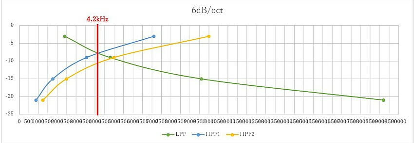 計算すると、クロスオーバーが、4.2kHzと、なっている。 有る資料を見ると、ウーハーから出る中域・ボーカルを 重視する場合、クロスは高め、4〜5kHzに設定し、ツィーターは、7kHz〜10kHzあたりの組み合わせが多いとの事。 現在のスピーカの設定は、正に この通りとなっている。 ただ、好みで言うと、中域が立ち上がっている音色は喧しくなるので、LPFはもっと下に設定したい。 これは、後程 コイルを取り寄せて検討する。