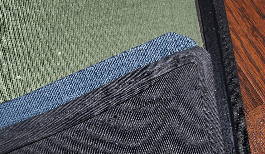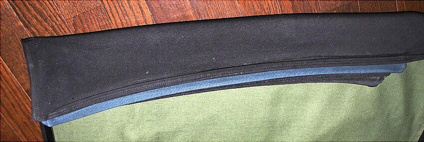 最初は、前端部のみにヒダを追加する事を考えたが、ヒダ全部を違う色で寸法も前端〜後端で同一になる様にする。 黒色キャンバス地の余りが有れば良かったのだが無い。手元に有るファーグリーンを使い、ワンポイントを入れた。