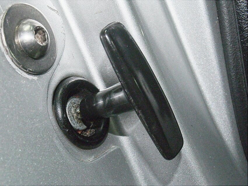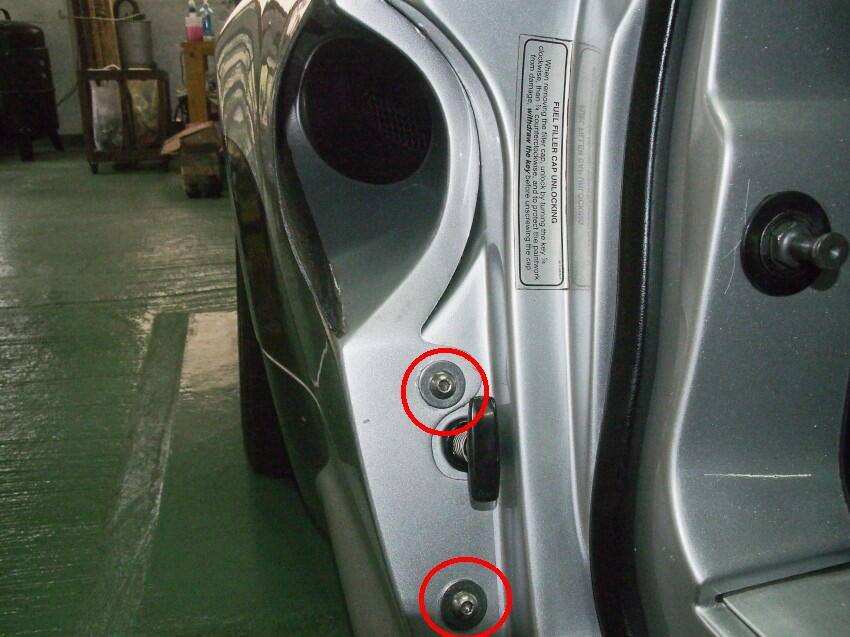 隙間を開けるのは簡単。ボルト2本を緩めて、ドア面と面一を確保しつつ、隙間を開けて締め直す。 これで、ギシギシ音は無くなった。