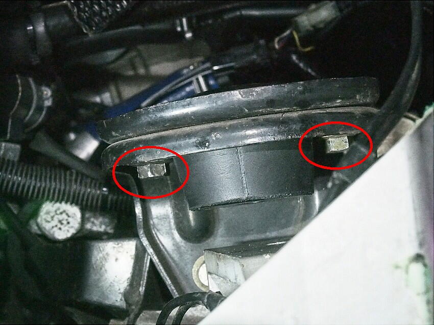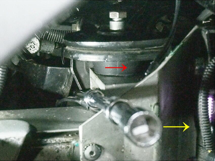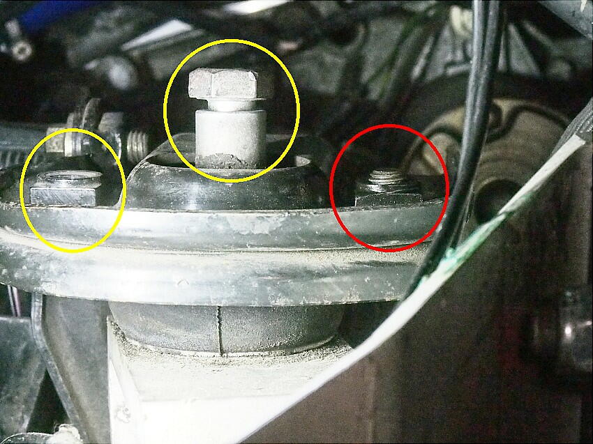 | 今度はミッションマウントの交換に掛かる。 外すのは、ボルト3本のみなので簡単だ。 下写真の黄丸のボルトを取り外すまでは順調に進んだ。 ところが、赤丸のボルトが回らない。ラスペネ吹いて作業を するが、全く歯が立たない。