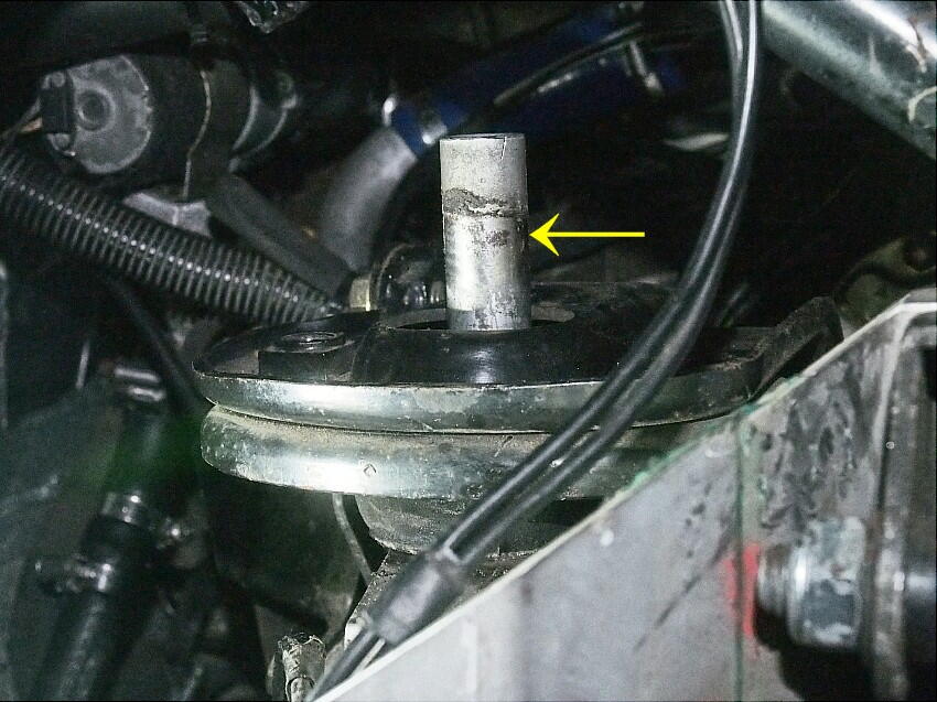 すると、バキッ音と共にT字レンチが動いた。捩切れたか ! と焦ったが、緩んでいた。( 嬉しい ネジを抜き取り、ミッションマウント中央のスリーブを抜き取る。( 下写真の←