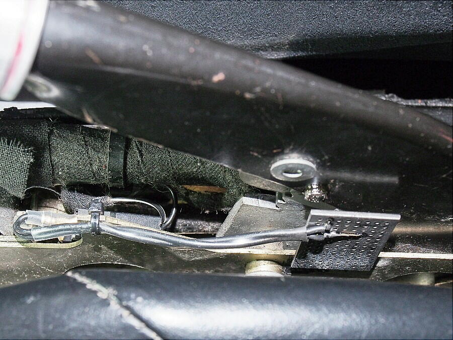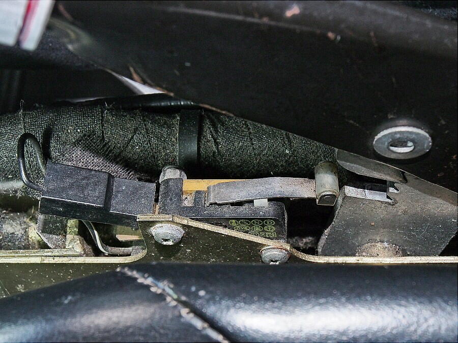 リードSWの端子にテスタを繋げ、ハンドブレーキレバーを上げ下げしながら、磁石を置く場所を確かめる。 位置が決まったら、磁石を接着し固定する。