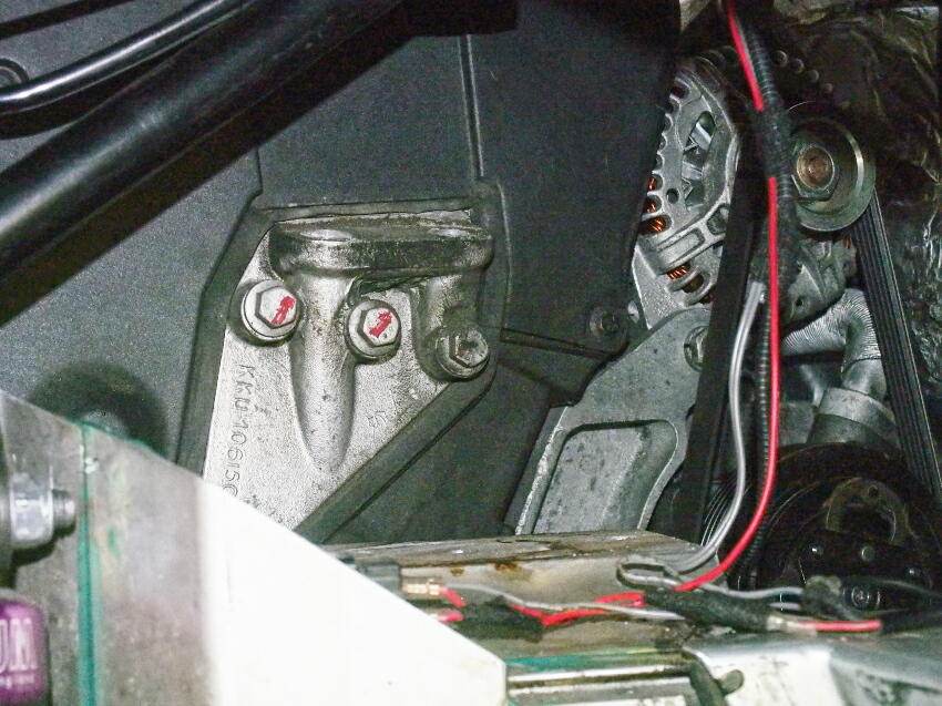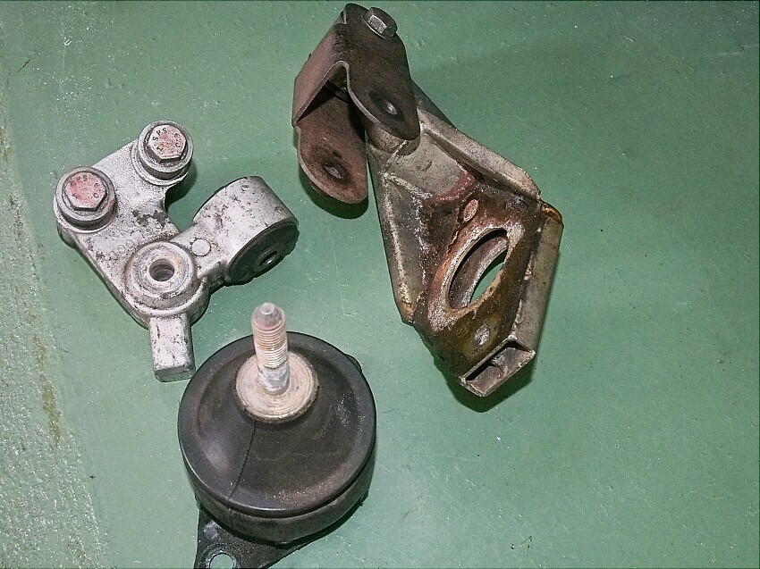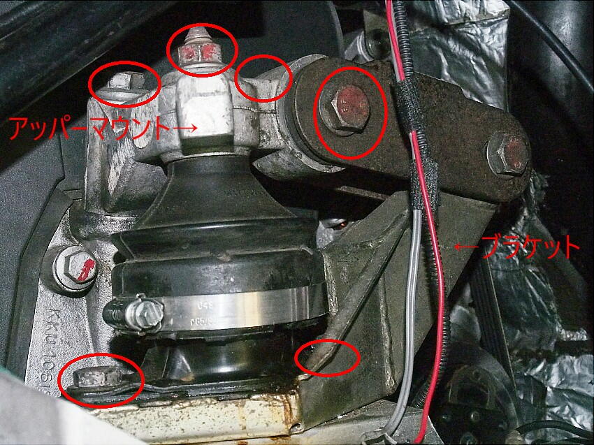 アッパーマウントのボルト、エンジンマウントのボルト、ブラケットのボルトを取り外し、エンジンマウント一式を 取り外す。ブラケットが、かなり汚いので洗浄する。