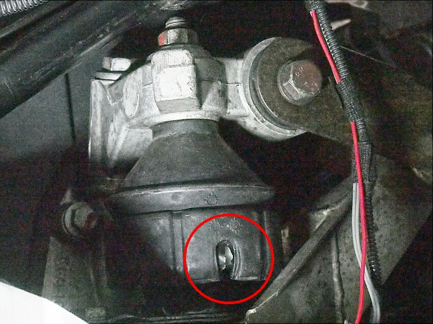 | 部品が届いたので、今日はエンジンマウントとブッシュを交換する。取り外すボルトは、下写真の赤〇の所。 オイルパン下には、圧力分散用の板を咬ませて、ジャッキを設置して置く。