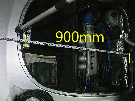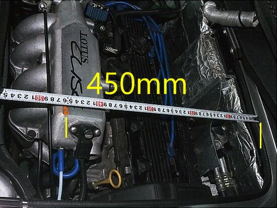 支点部のカラー5mmを作成して追加せねばならないのだが、いや、待てよと、巻き尺を持ち出し計る。 支点部に5mmのカラーを入れると、θ=0.318角度が付くが、450mmの所では、2.5mmの余裕しか 生まれない。 干渉部を見ると、5mm程は空間を持たせたい。 そうなると、カラー + インマニ2.5mmの削りが必要となる ..... 面倒じゃ 干渉しているフード部の一部網を切除するか、網を潰した方が良いのか。 悩ましい
