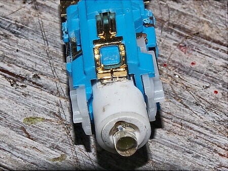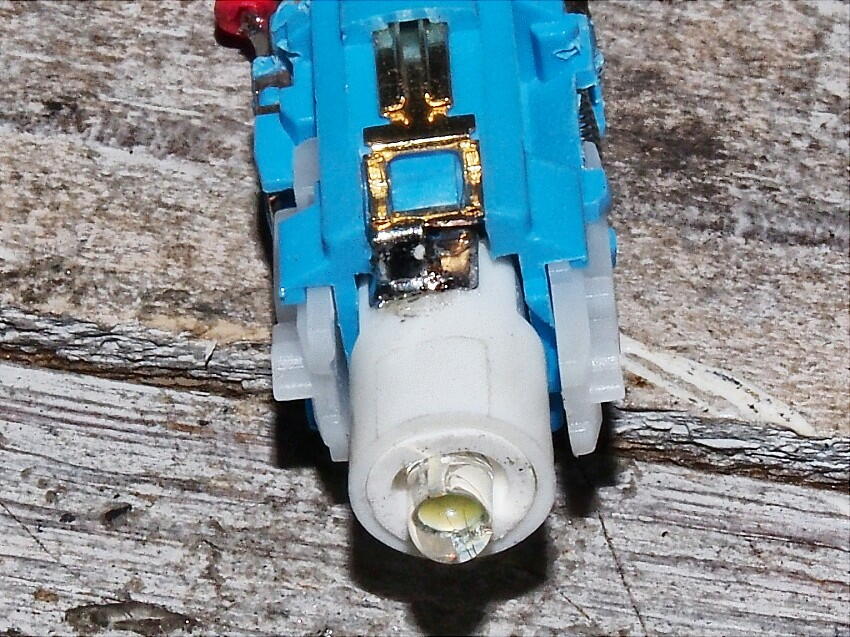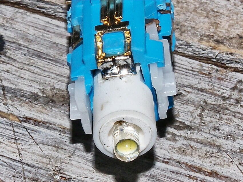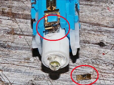 故障の原因は、大方予想は付くので、バラス。 バラスと、金属片が転がり落ちた。 見てみると、LEDを支えているソケット側の端子だ。 端子の接触不良と予想していたが、端子折れとは。