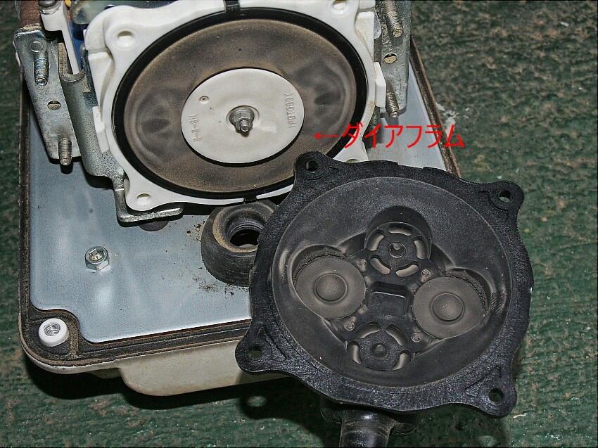 このダイヤフラムは交換部品として手に入るが、ポンプ自体も5年経過しているし、交換部品も合うかどうかも解らない。 ( 現製品は、90L/分だが、交換部品の能力が解らないのだ ) なので、値段は張るが、新品ポンプの注文と共に、ダイアフラムも注文して置いた。