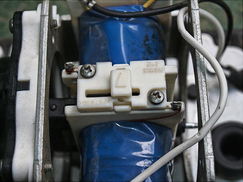 このポンプは、左右に摺動して、ダイヤフラム(空気室)を伸縮させ( 空気を吸引/圧縮 )、浄化槽に空気を圧送している。 この構造自体が、ナンセンス。 50Hzで吸引/圧縮をさせるので、振動音が煩い上、ダイヤフラムの材質はゴム。 これで 長年持たす事は出来ない。 ( 50Hzでは 3,000回/分 、年間で、約16億回 摺動 )。 何故、回転系の ベーンポンプとか、渦巻ポンプとかを使用しないのだろう ?