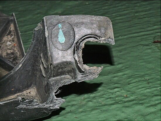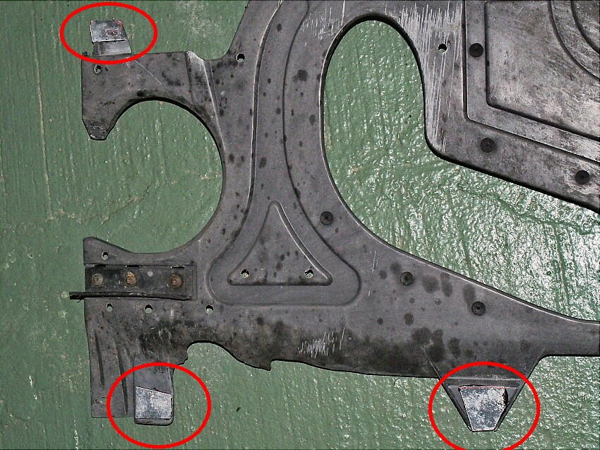 アンダーパネルを外すと、下の赤丸の保持部が全て破壊されていた。 既に脆いアンダーパネルなのだが、それでも 水圧で、引き千切られた様を見ると、圧力の凄さを感じた。