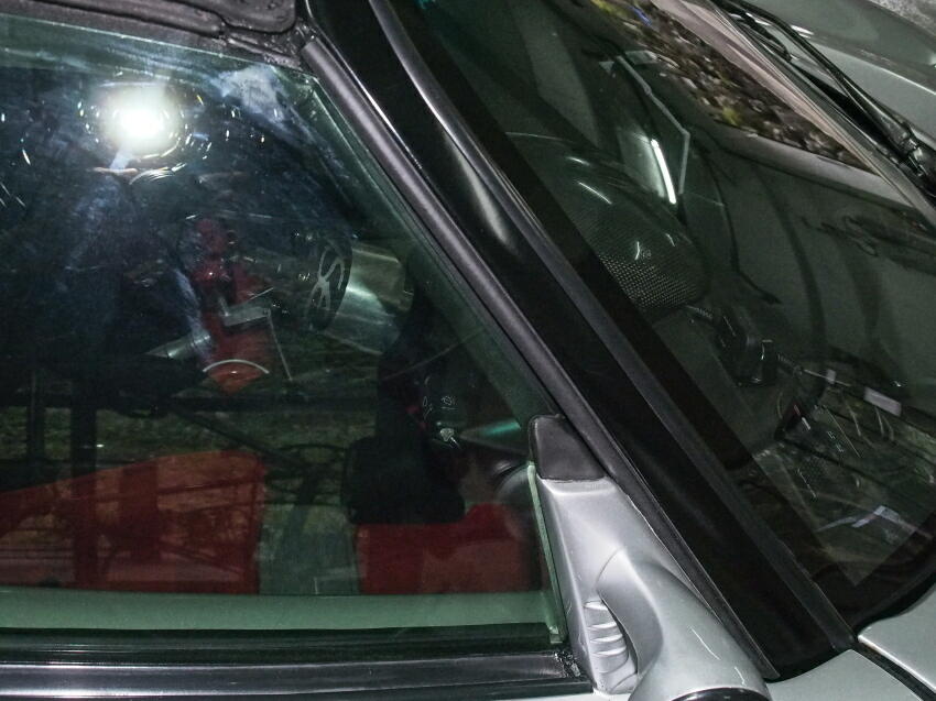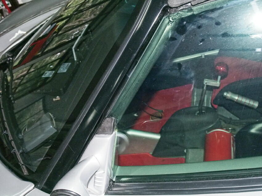 | ここの空間を何とかしたい。煩い車ではあるが、防げようの有る風切り音は抑えたい。 Aピラーとサイドガラスとの隙間は、10mmも有る。普通の車なら、ミリ単位の隙間しかない所。 細かな所は気にせず、運転を楽しむ車ではあるのだが、サイドモールぐらい付けて欲しかったと思う。
