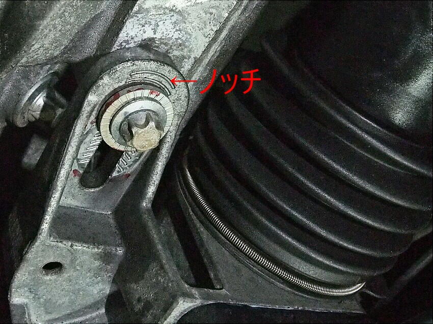 ここから3ノッチ(6mm)、さらにアクチュエータをスライドさせ( クラッチリリースレバー側へ押し込み ) ボルトを固定する。これが、冒頭に載せた整備書通りのやり方。下が正しく調整した後。 ( 以前は、少し残った赤線の位置だった。 3ノッチ分異なる )