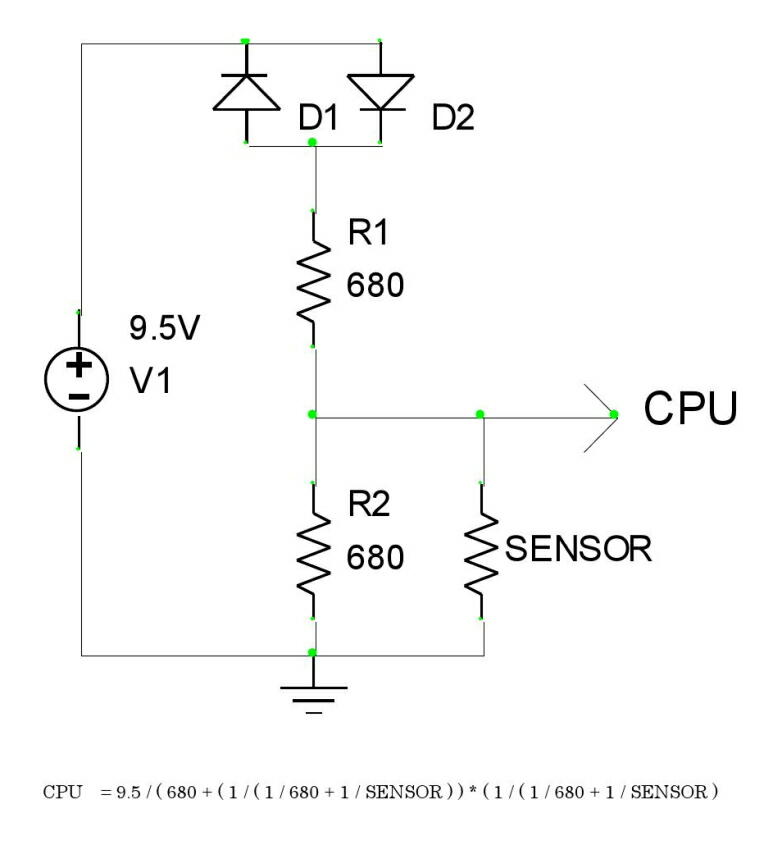 また、回路の下に示した数式で、センサーからの出力電圧値(CPUへの入力値)が求められる。