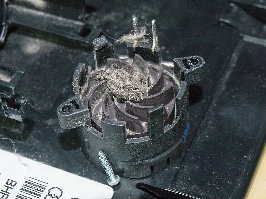 ファンは、2本のネジを外した後、引き抜く。 ご覧の通り、ファン部と電源端子は、埃まみれとなっていた。